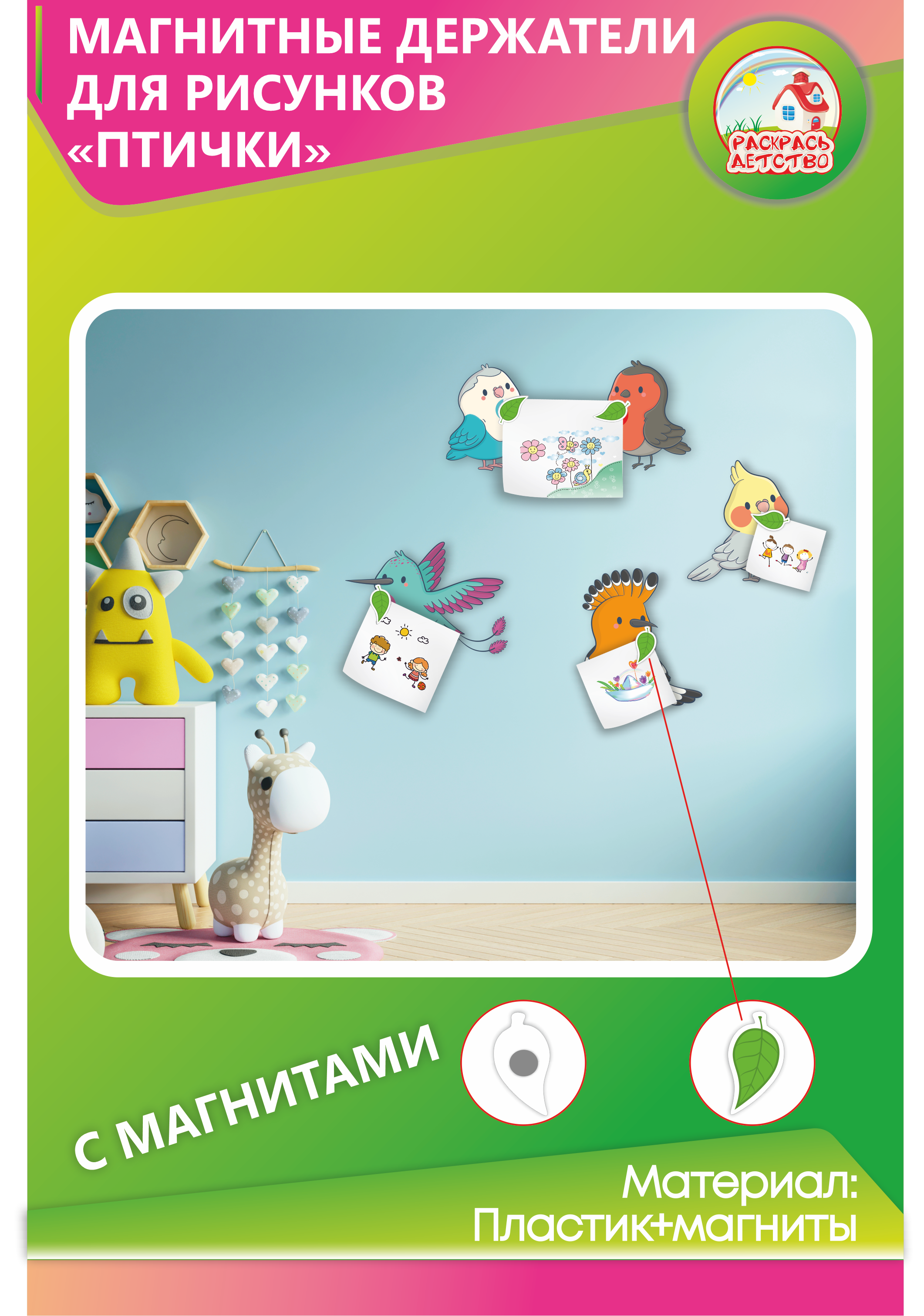 Рисунки отлично держатся неодимовыми магнитами к магнитным вставкам на фигурах птичек.