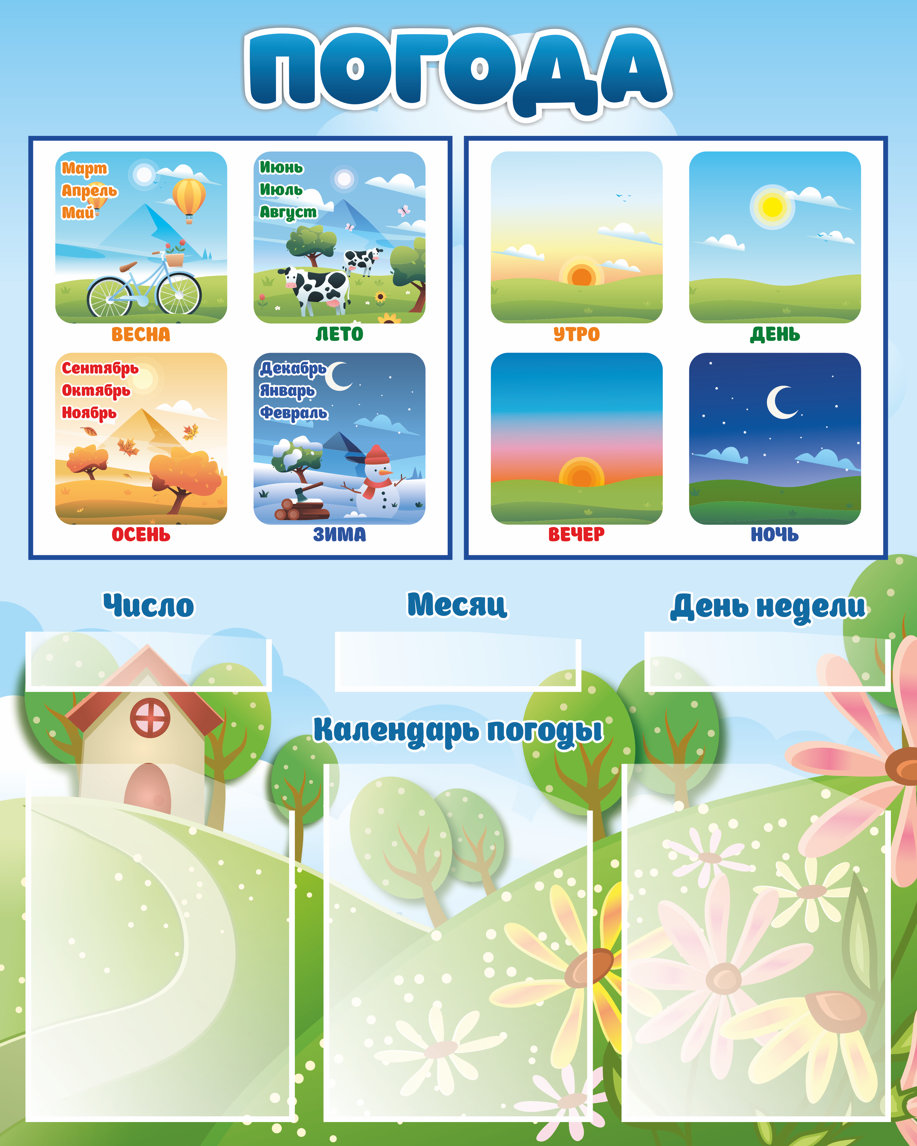 Стенд "Погода" обучающий для оформления учебных классов, комнат, коридоров, кабинетов, поможет в проведении уроков по окружающему миру и для самостоятельного изучения дома. Яркий красочный оформительский стенд поможет сделать занятия с детьми еще более интересными.