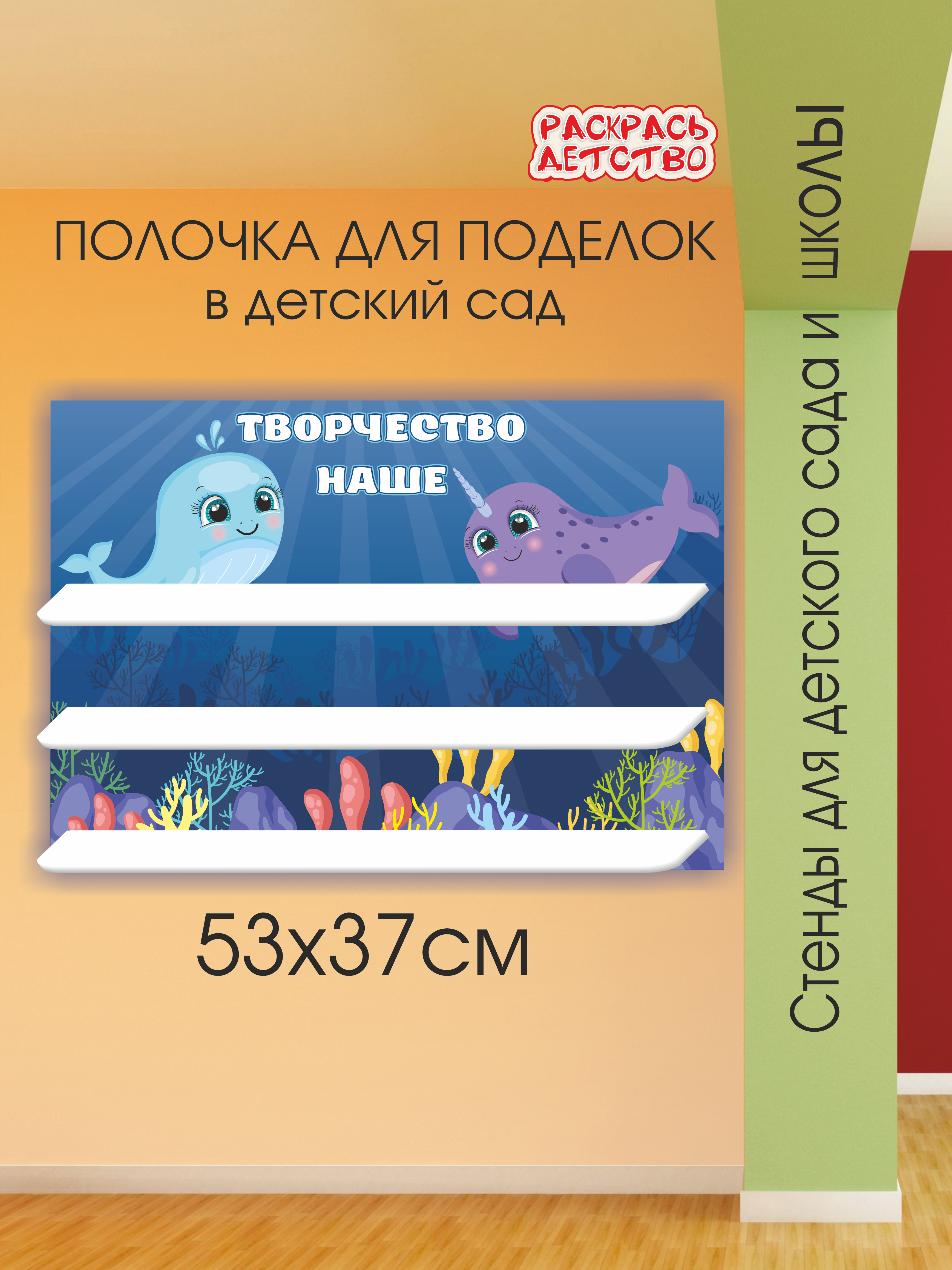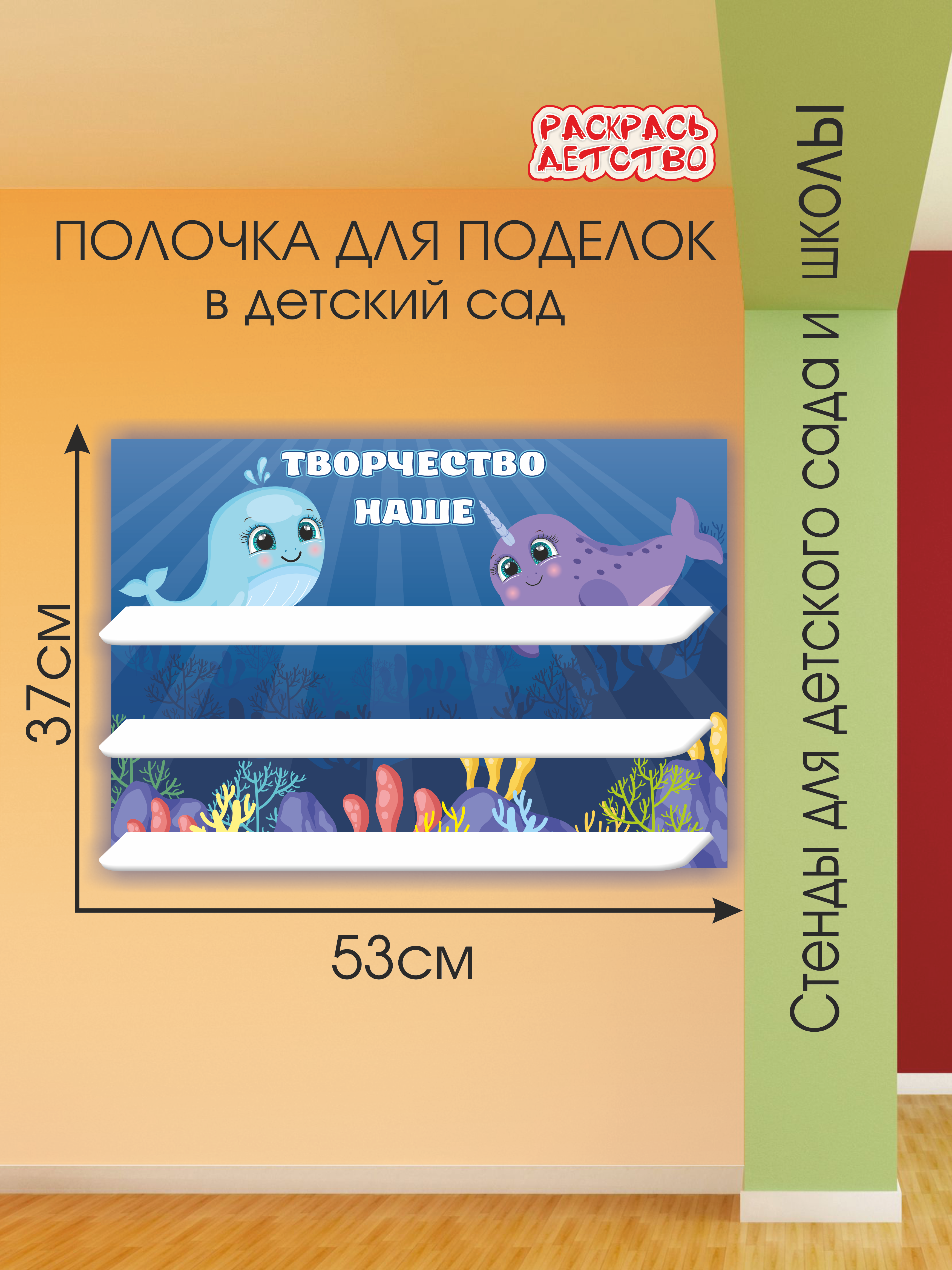 Стеллаж-полка для лепки "Морская" — это удобное и стильное решение для организации творческого пространства в детском саду, которое поможет красиво оформить выставку детских работ. Настенная полочка размером 37*53 см с двумя подставками для поделок изготовлена из прочного ПВХ-пластика (3 мм для основы и 5 мм для полок), что гарантирует надежное крепление даже объемных работ по лепке. Качественная печать с защитной ламинацией обеспечивает стойкость к выцветанию и возможность влажной уборки дезинфицирующими средствами, что особенно важно для детских учреждений. Эта практичная полка-стеллаж подойдет не только для детского сада - ее можно использовать в творческих студиях или даже дома для организации хранения материалов и демонстрации детских поделок.