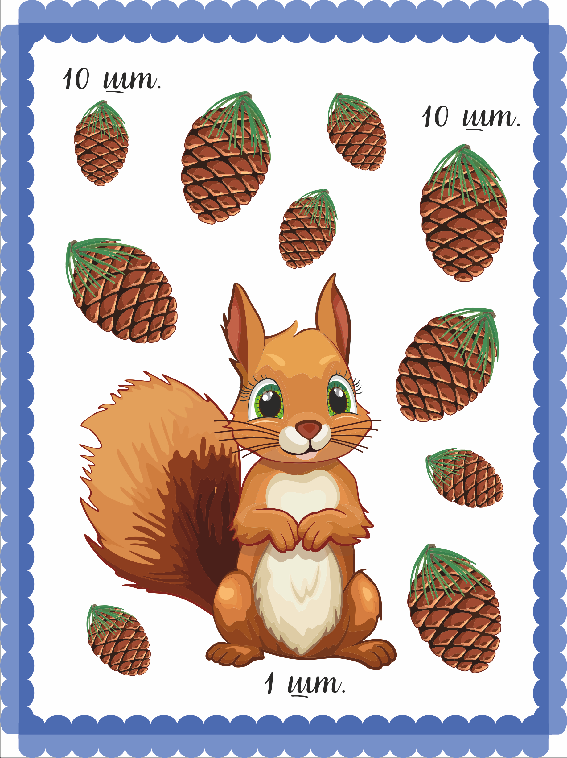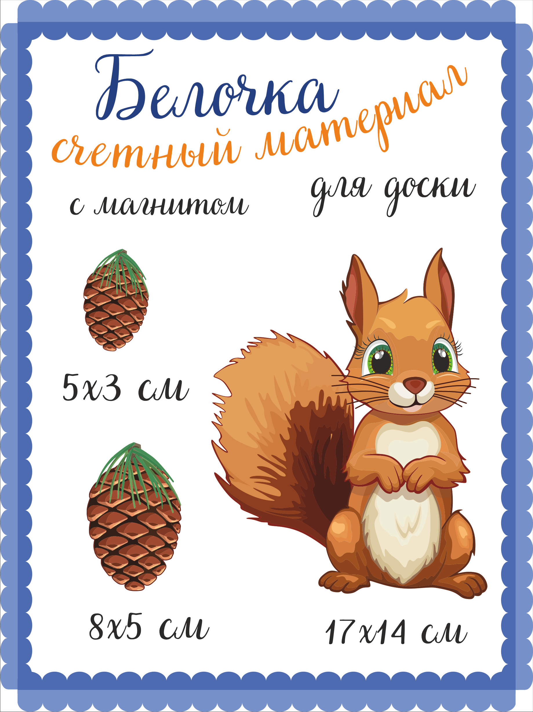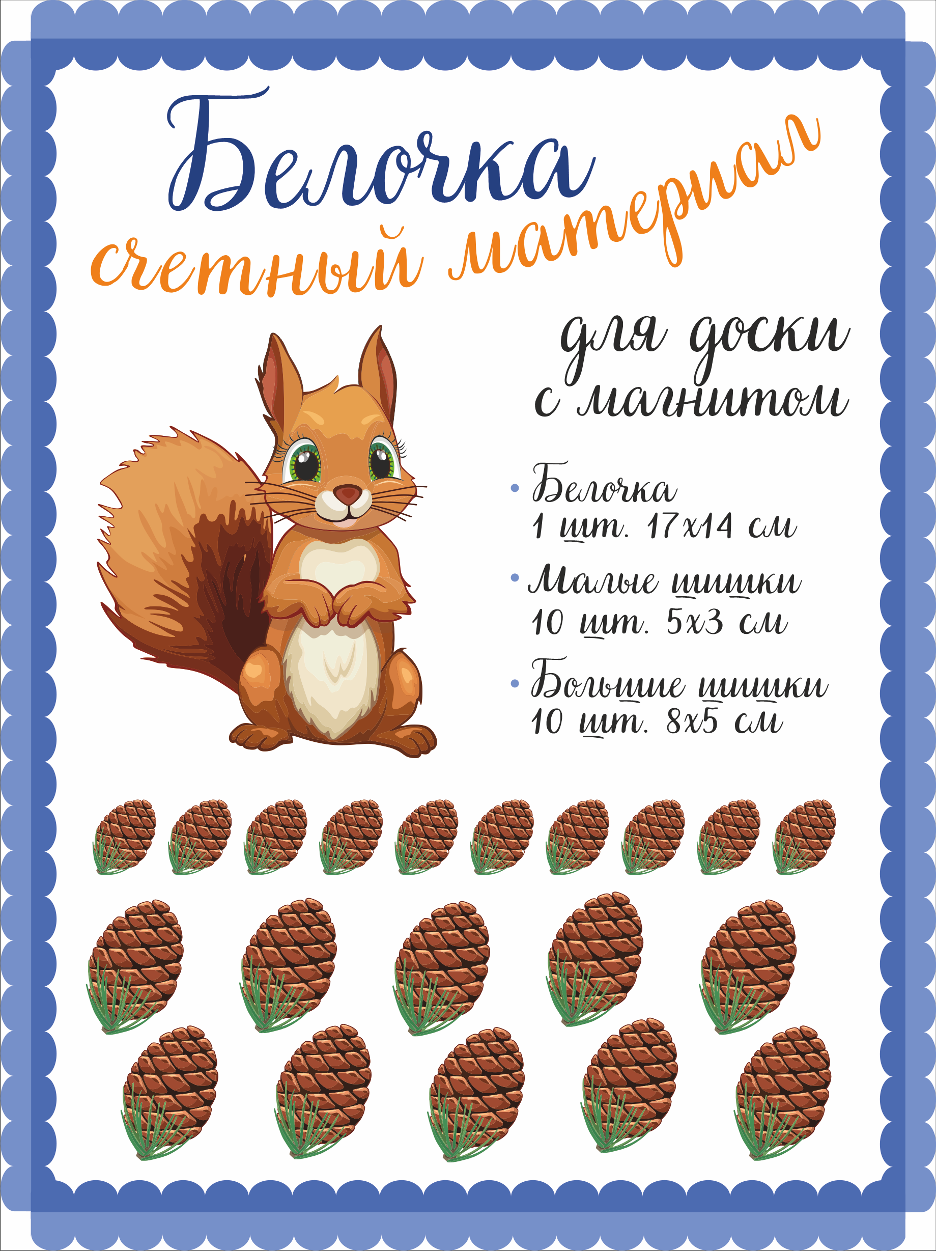 Счетный материал для доски для самых маленьких «Белочка с шишками». Изготовлен из прочного и безопасного 2 мм ПВХ пластика, его можно мыть и обрабатывать дезинфицирующими растворами. Сзади прикреплены магниты. В комплекте 20 шишек и 1 белочка. Шишки в двух размерах - большие 8х5 см и маленькие 5х8 см. Они идеально подходят для занятий в группе детского сада по изучению цветов, счета и сравнения размеров.