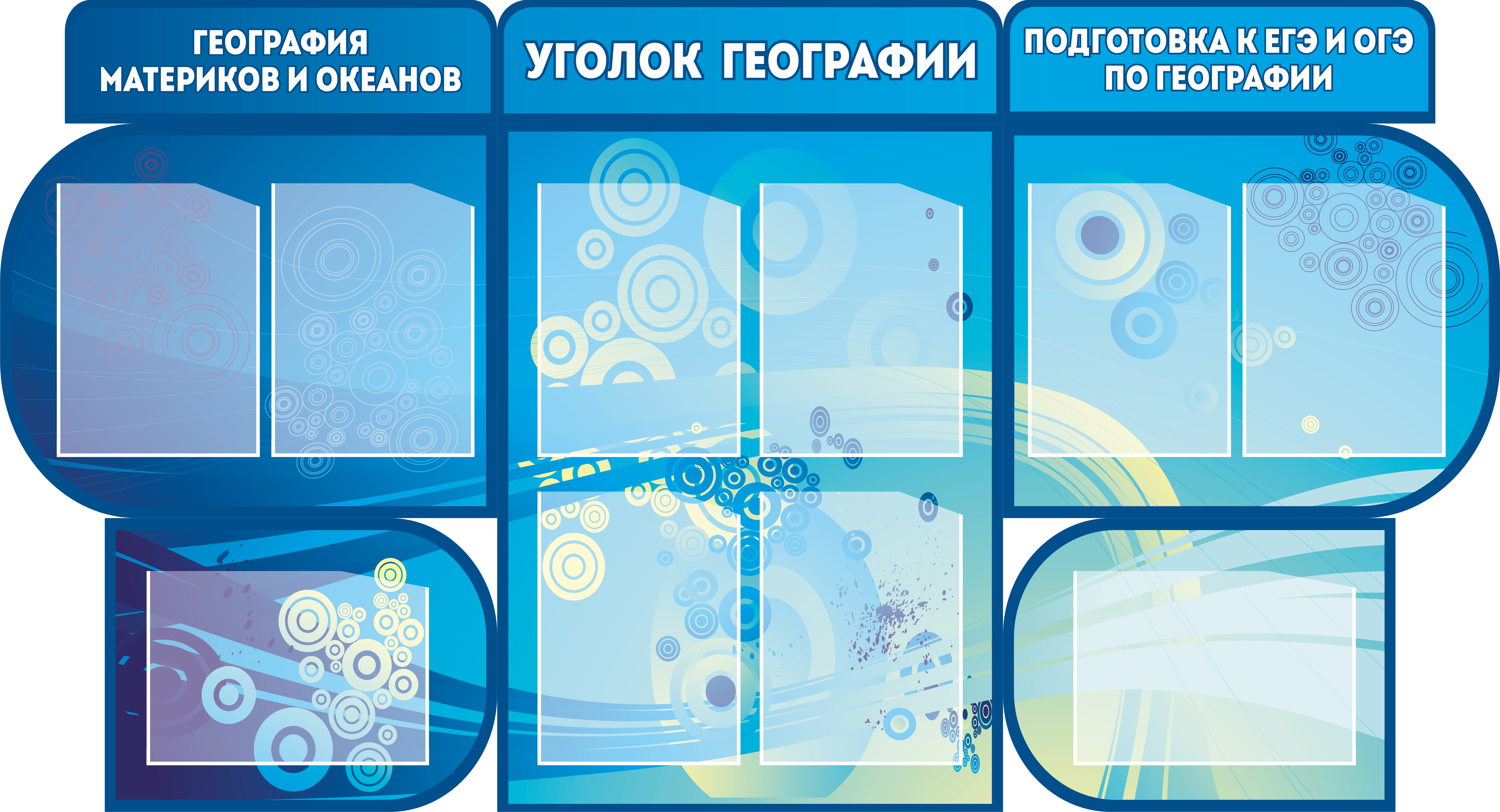 Стенд в кабинет географии для школы и детских центров изготовлен из ПВХ пластика 3 мм, с использованием самоклеящейся интерьерной печати и защищен специальной ламинацией для увеличения срока эксплуатации. Общий размер 170х92 см, состоит из 9ти частей. На данном стенде можно разместить информацию о проведении экзаменов ЕГЭ и ОГЭ и любую текущую информацию. 10 карманов формата А4 позволит разместить большое количество информации для школьников и их родителей.