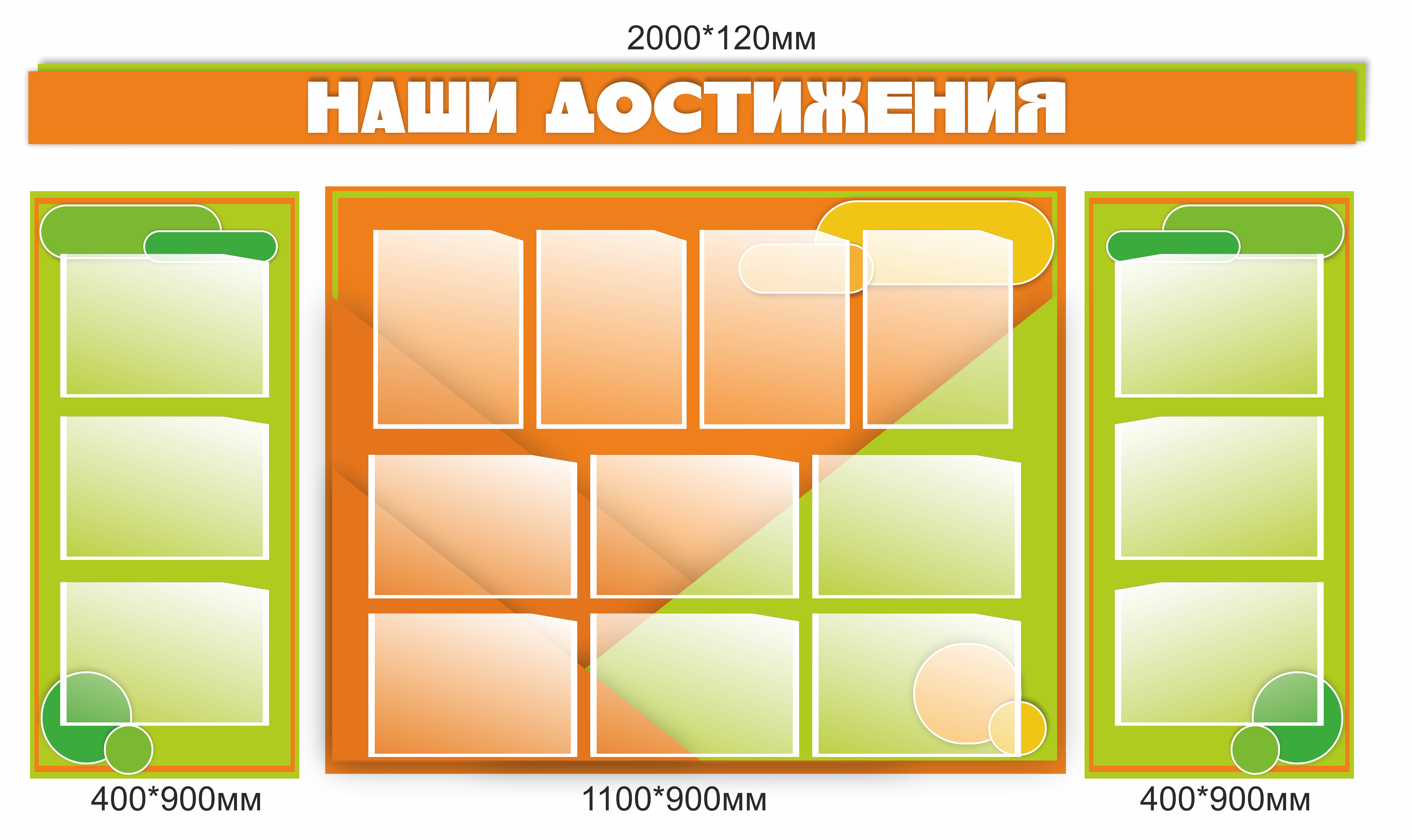 Размер одного: центр 1,1*0,9м, 0,4*0,9м 2шт, заголовок 2*0,12м