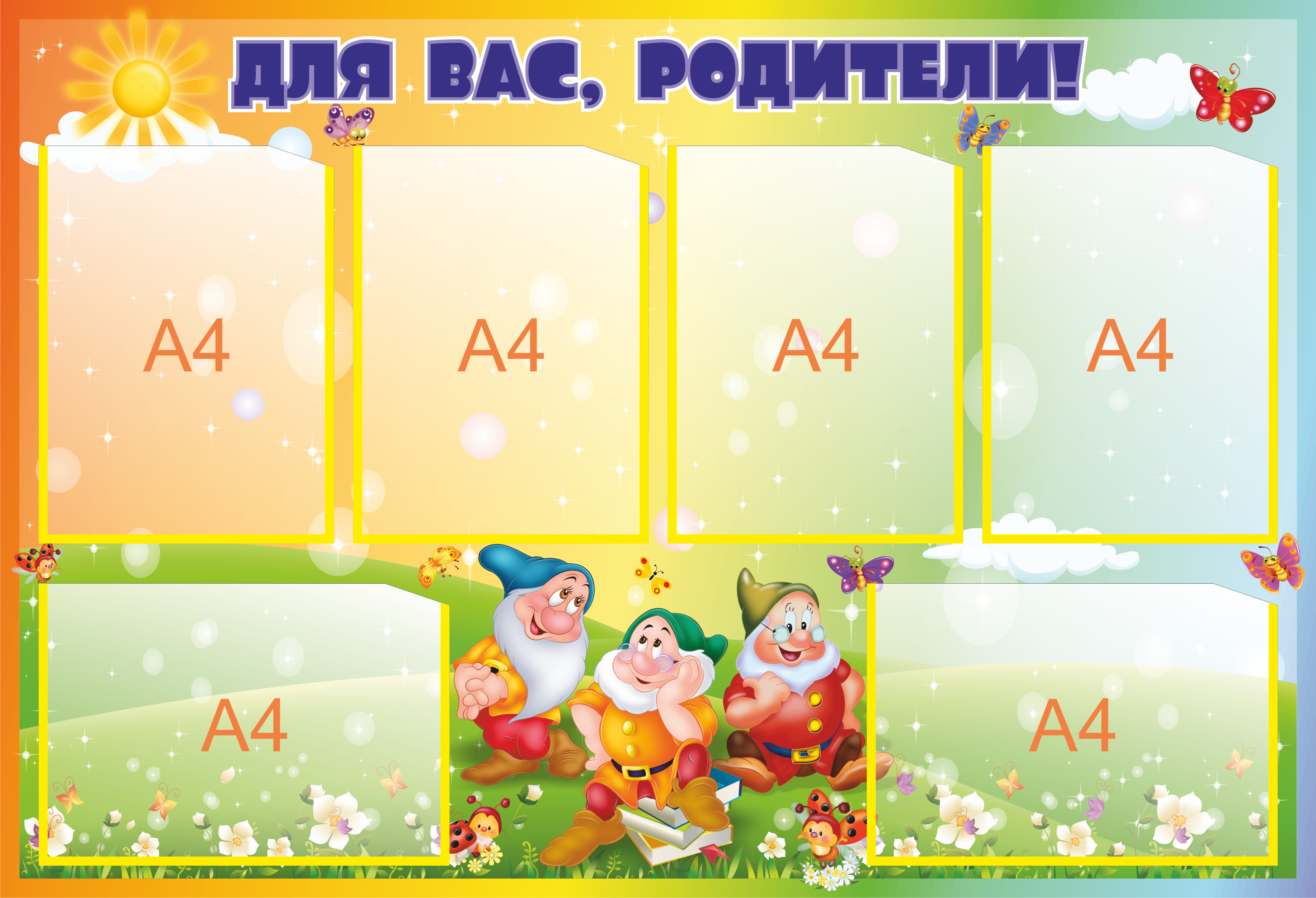 Стенд в группу детского сада – это прекрасный способ украсить пространство. Наши стенды яркие за счет высокого качества печати и современного оборудования. Защитное покрытие (ламинация) позволяет увеличить срок эксплуатации на 3-4 года. Стенды в детский сад – это современный способ донести важную информацию до родителей.